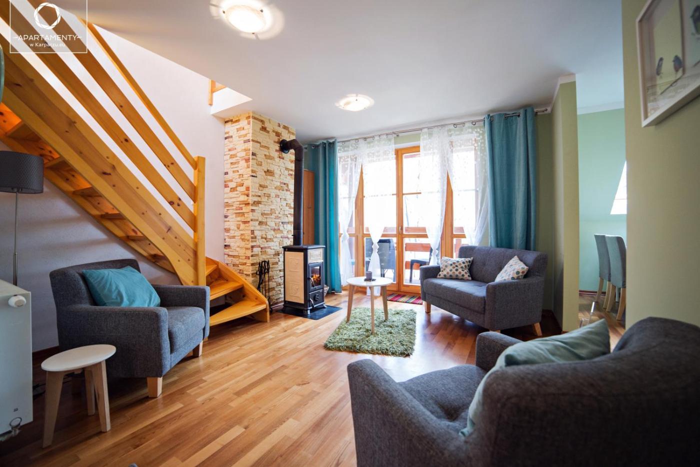 Apartament przy stoku narciarskim – Karmel. This apartment features a fireplace. This spacious apartment features 2 living rooms, 2 separate bedrooms and 1 bathroom with a shower and a bidet. Meals can be prepared in the well-fitted kitchenette, which has a stovetop, a refrigerator, a dishwasher and kitchenware. Boasting a balcony, this apartment also features a private entrance, a coffee machine and a flat-screen TV. The unit has 5 beds. Apartament - 8 osobowy. Powierzchnia pokoju ok.: 80 mkw.
