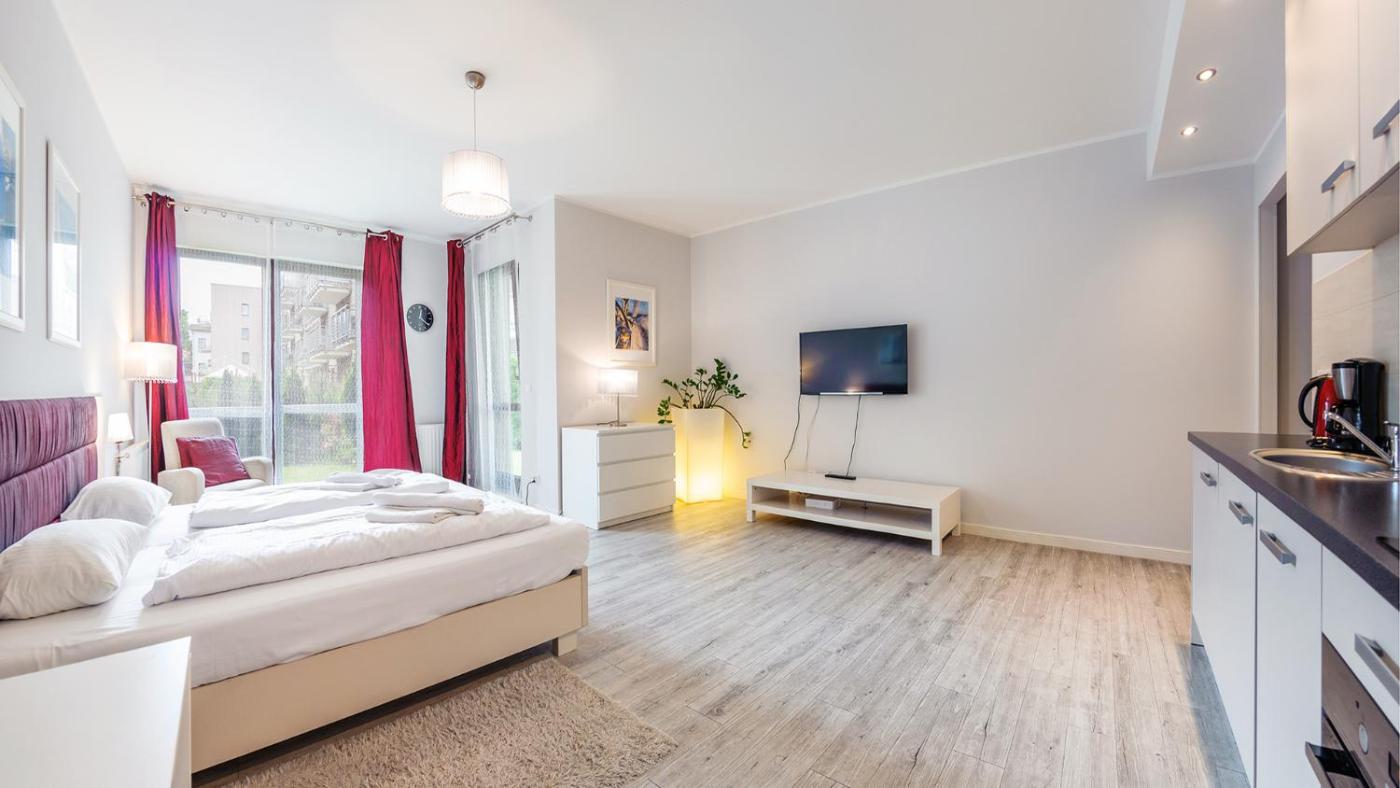 Apartament typu studio. Boasting a private entrance, this apartment features a kitchen, 1 bedroom and 1 bathroom with a walk-in shower and a hairdryer. Meals can be prepared in the kitchen, which has a stovetop, a refrigerator, a dishwasher and kitchenware. Featuring a terrace with ancourtyard view, this apartment also features a washing machine and a flat-screen TV. The unit has 2 beds. Apartament - 2 osobowy. Powierzchnia pokoju ok.: 30 mkw.